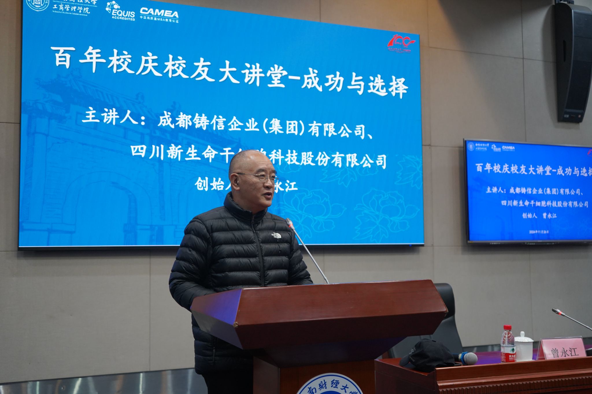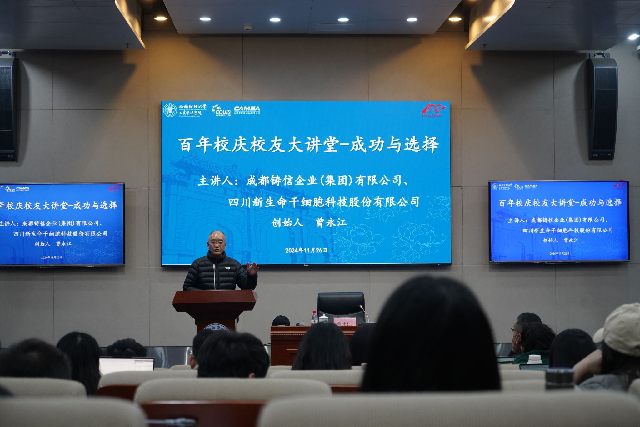11月26日下午,“百年校庆校友大讲堂”主题讲座《成功与选择》在弘远楼101会议室成功举行。必赢官网杰出校友代表,1992级硕士、2003级博士,四川省优秀企业家、深圳市优秀企业家,成都铸信企业(集团)有限公司、四川新生命干细胞科技股份有限公司创始人曾永江作为主讲嘉宾。学院党委书记郑茂、院长李涵,学院师生代表200余人参加讲座。李涵主持本次讲座。